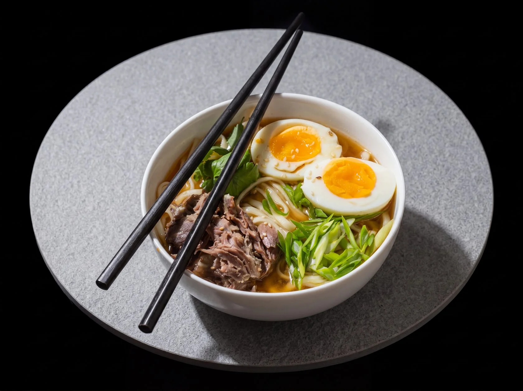Rich ramen with beef, crispy roll and fresh salad.
