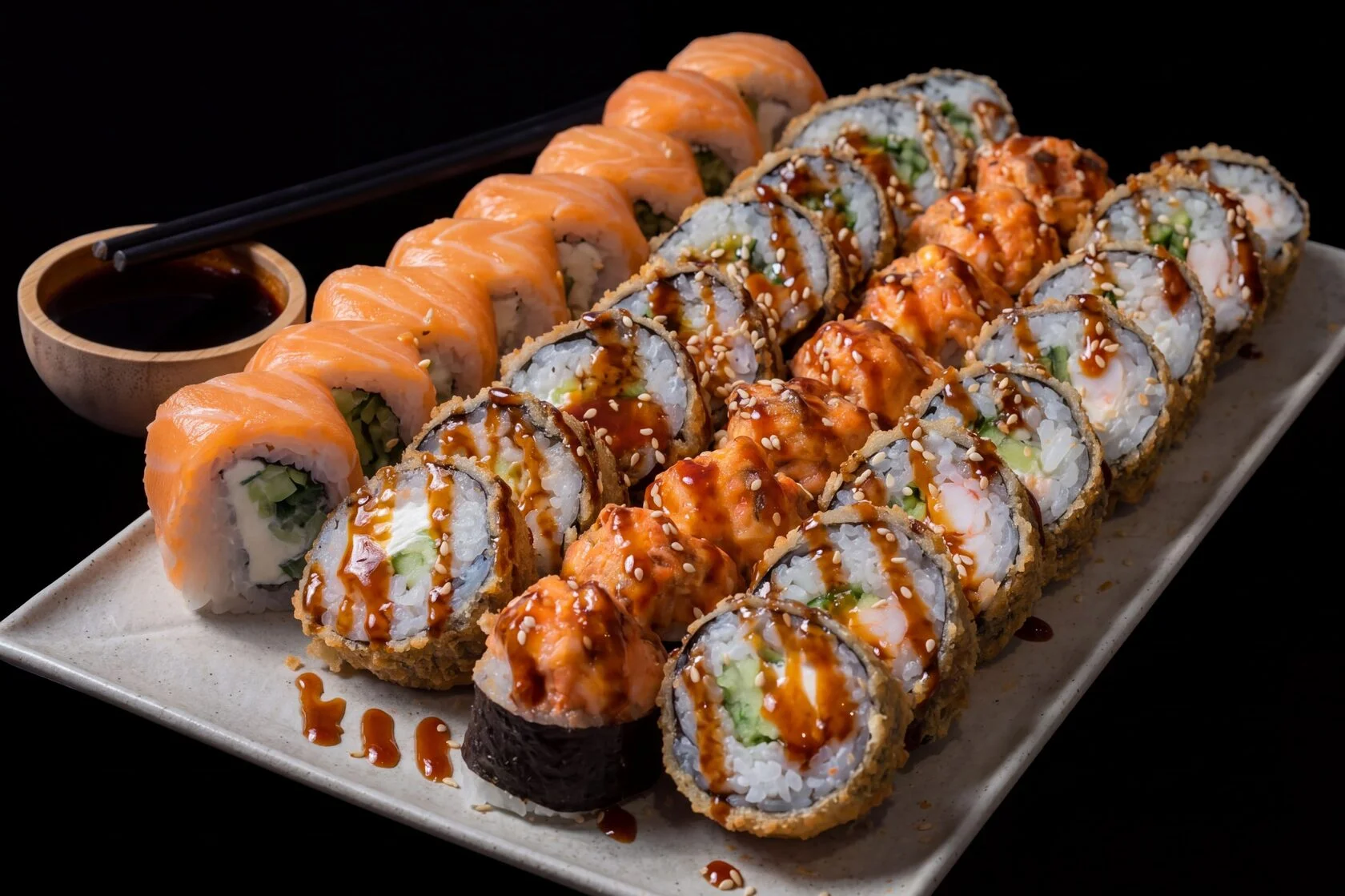 Hearty tempura roll with salmon and crispy crust.